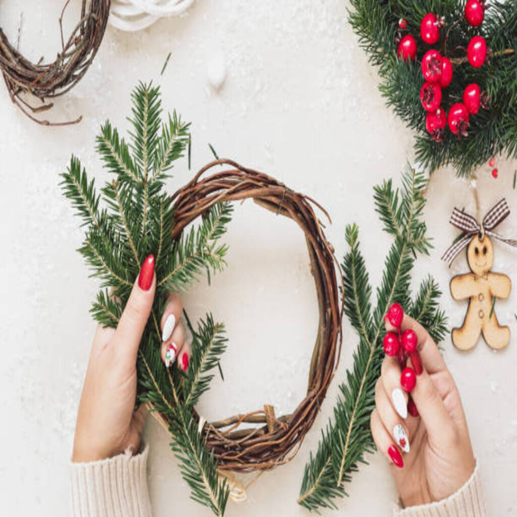 Prepare Decorations: If you’re using artificial greenery, cut it into smaller sprigs. For other decorations, make sure they are ready for stringing. For example: